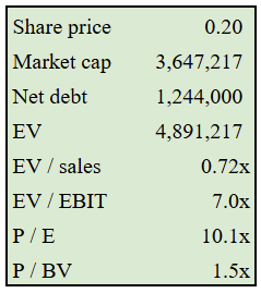 Annual sales were $6.8 million and operating profit was a little over $700,000. The company had $1.4 million in debt and $161,000 of cash. Valuation figures were as follows: