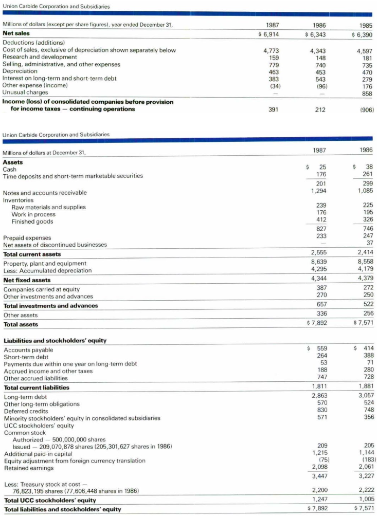 UCC was going through a restructuring in the late 1980s driven in part by lawsuits and environmental liabilities (related to multiple chemical leaks and the Bhopal Disaster).