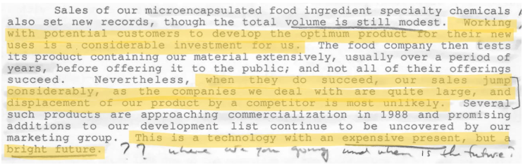 The microencapsulation business had long lead times as food companies required extensive testing, studying, and different rounds of approval. But these were large companies with potential for high volumes.