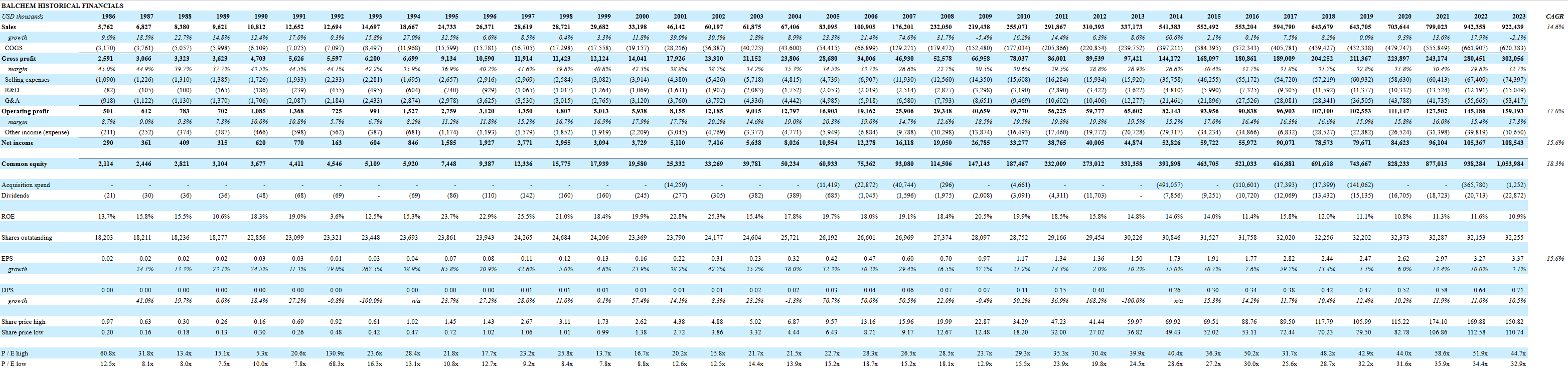 Performance was even better the first couple decades when Balchem’s ROE was in the high teens/low 20s. The return was obviously helped by a period-ending P/E ratio of nearly quadruple where it started (10x to 40x).