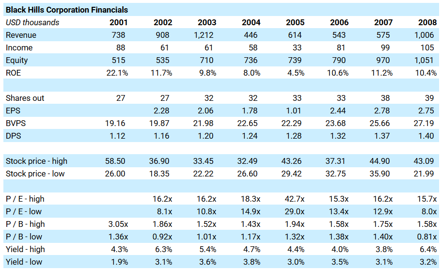 Black Hills could be described as a decent and predictable business in the years leading up to Charlie's purchase. ROE was in the low double digits and book value per share growth (adding back dividends) averaged 11% from 2002 to 2008.