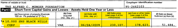 The Alfred C. Munger Foundation (named for Charlie's father) sold 10,000 shares of Black Hills Corporation (BKH) for $23 each in June 2009, resulting in a short-term gain of 29%.