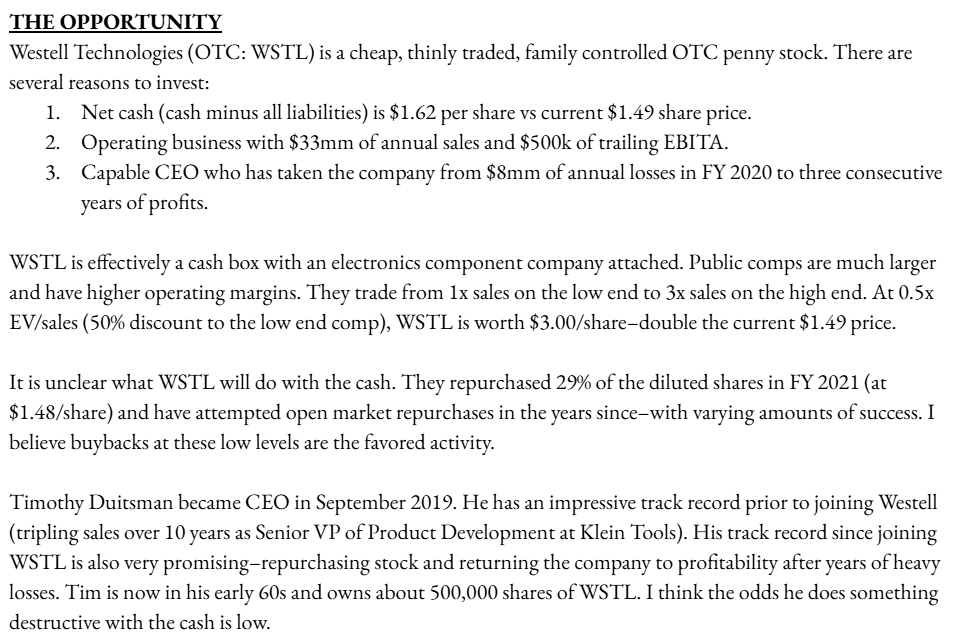 WSTL - Electronic communications manufacturer. About a year ago, WSTL traded for less than its net cash. The company was thought of as a "value trap" with breakeven operations and constant share dilution. Here's what I wrote in an internal memo: