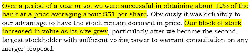 Over a period of about one year, Buffett bought 12% of the bank at an average price of $51 per share.