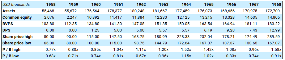 Over the next eight years, HCNB grew its book value from $135 to $183 per share (4% CAGR) and paid $57 per share of dividends. The average stock price in 1968 was $228 (1.25x book value).