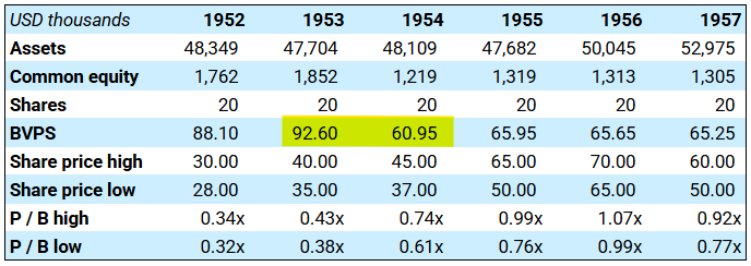 A sharp increase in reserves, coinciding with rising interest rates, caused a big hit in 1954. This was magnified by the fact that Commonwealth's equity was only 4% of assets going into the year. Book value per share fell 34%.
