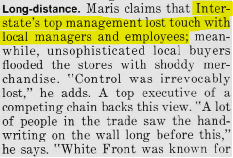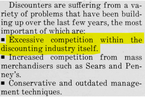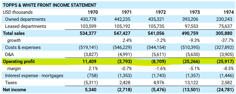 At its peak in 1969, Interstate was producing revenues of $589 million with $11 million of net income. But by the early 1970s, discount stores were starting to crack. Over expansion and increased competition, coupled with a sharp and sudden recession, caused many locations to turn unprofitable. Topps and White Front weren't immune to this. Both started bleeding red ink and pushing Interstate into financial trouble.