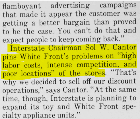 Sol Cantor was the Chairman and chief architect of Interstate. He had purchased the White Front discount store chain on the West Coast in 1959 and its Midwest and East Coast-equivalent Topps Discount in 1960. These discount stores were growing rapidly in the 1950s and 1960s as Americans moved to the suburbs.
