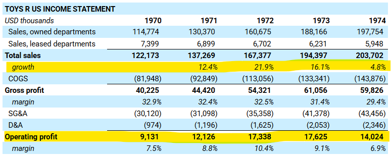These numbers are especially impressive given Interstate's problems in the discount store segment during this period. Toys R Us was effectively subsidizing the losses of the other divisions. It wasn't getting the attention and capital investment it deserved, yet it was still growing in the double digits.