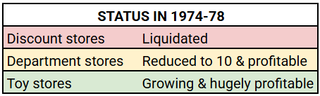 Here you had a bulky retail conglomerate with three main divisions: department stores, discount stores, and toy stores. The company went bankrupt due to the first two (department stores and discount stores). The department stores were being pared back, and the discount division was liquidated. Meanwhile, the toy division was a gem producing huge profits with excellent future growth prospects.