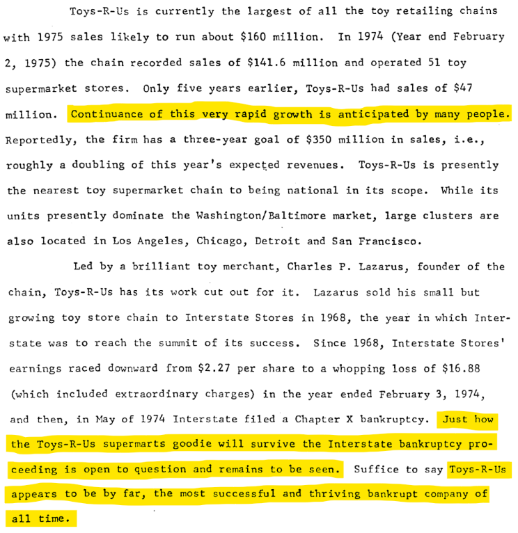 Larry wrote a report for Barron's in 1975 titled "Revolution in Toy Retailing." The report came out early in the bankruptcy and outlined the attractive prospects for Toys R Us.