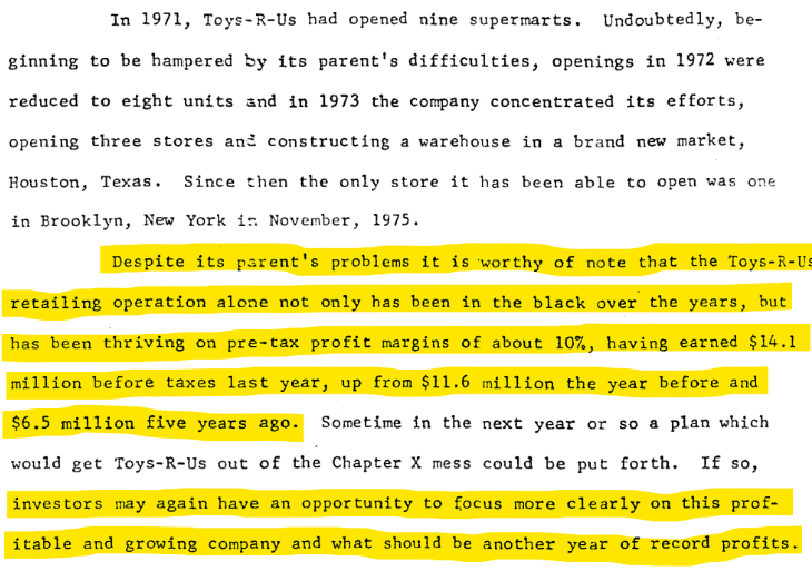 The appeal of Toys R Us in the mid-1970s wasn't a secret. A number of smart investors had the insight and participated in the bankruptcy.