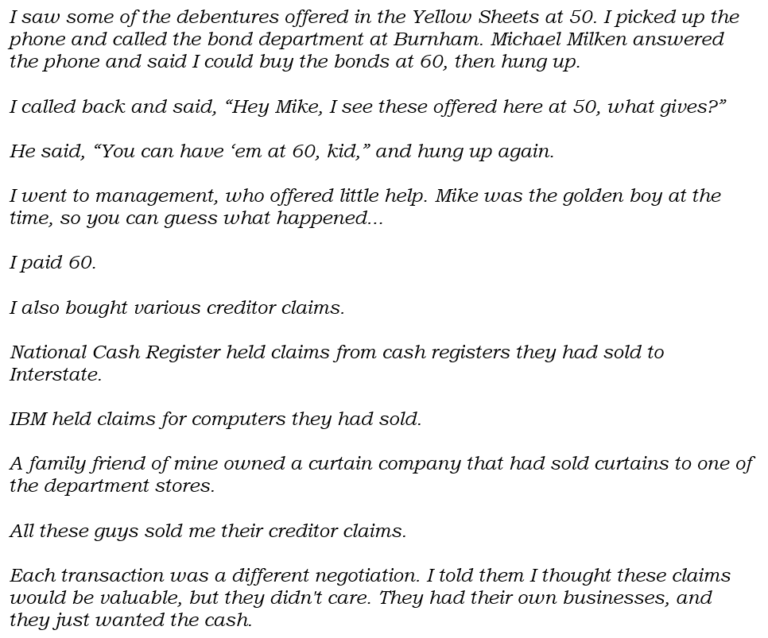 Shortly after writing his report, Larry started buying Interstate Stores convertible debentures and creditor claims with the idea that they would eventually turn into new common stock post-bankruptcy.