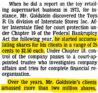 -Larry Goldstein was certainly at the "right place, right time" when it came to the Interstate bankruptcy and his knowledge of the toy business. I've found that good investors consistently gravitate towards the most compelling situations. They have a nose for opportunity. Larry could see the growth potential in big box toy retailing and his natural curiosity led him to learn about the industry and strike up relationships there.