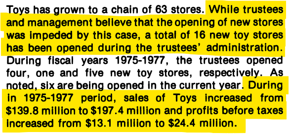 Toys continued to grow during bankruptcy, despite being starved of resources it could have used to grow faster.