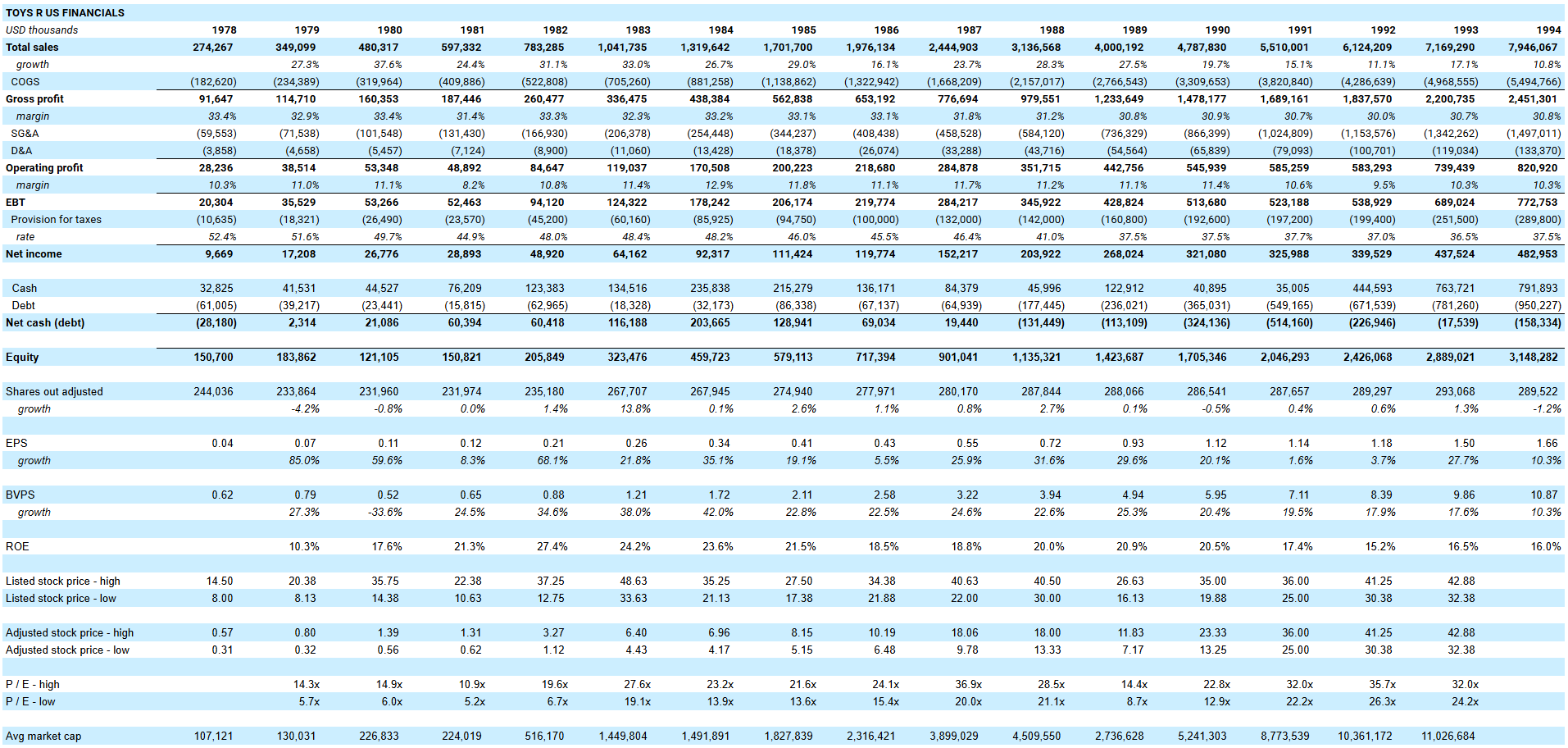 From 1978 to 1994, Toys grew its revenues from $274 million to just shy of $8 billion—good for a CAGR of 23%. EPS did even better, compounding at 26%.