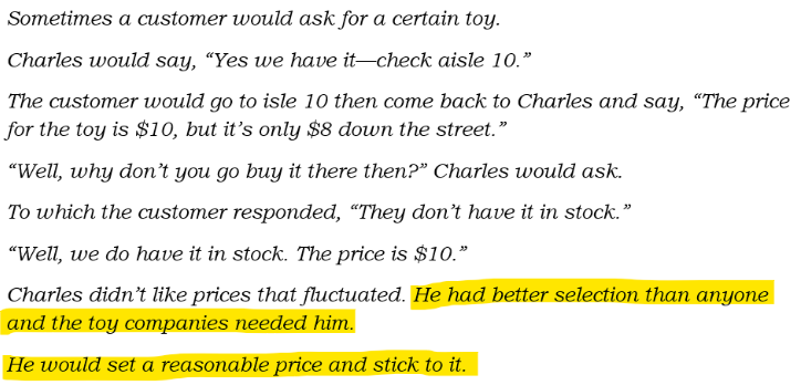 Toys R Us dominated toy retailing by providing the widest selection of goods all under one roof at prices lower than the alternatives. As Charles used to say, "If the toy exists, we have it and the price is right." Their scale and efficient distribution gave them a cost advantage, which was passed along to customers in the form of lower prices.