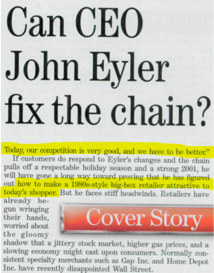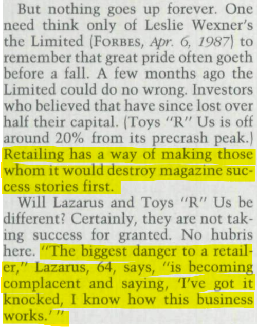 You see this time and again in retail. And Lazarus knew the perils of retail competition well. Here's what he said in 1988: