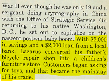 -By 1975, Larry had met with all of the toy retailers except Charles Lazarus. CL was harder to reach because he was the head of a division of Interstate—not the head of the whole company. Division leaders rarely meet with Wall Street (both then and now). Larry sent Charles a draft of his "Revolution in Toy Retailing" article which includes the line, "Led by a brilliant toy merchant..." Larry said it was this agreeable terminology that finally secured an invite to visit. The two then had a multi-decade, mutually beneficial business relationship.