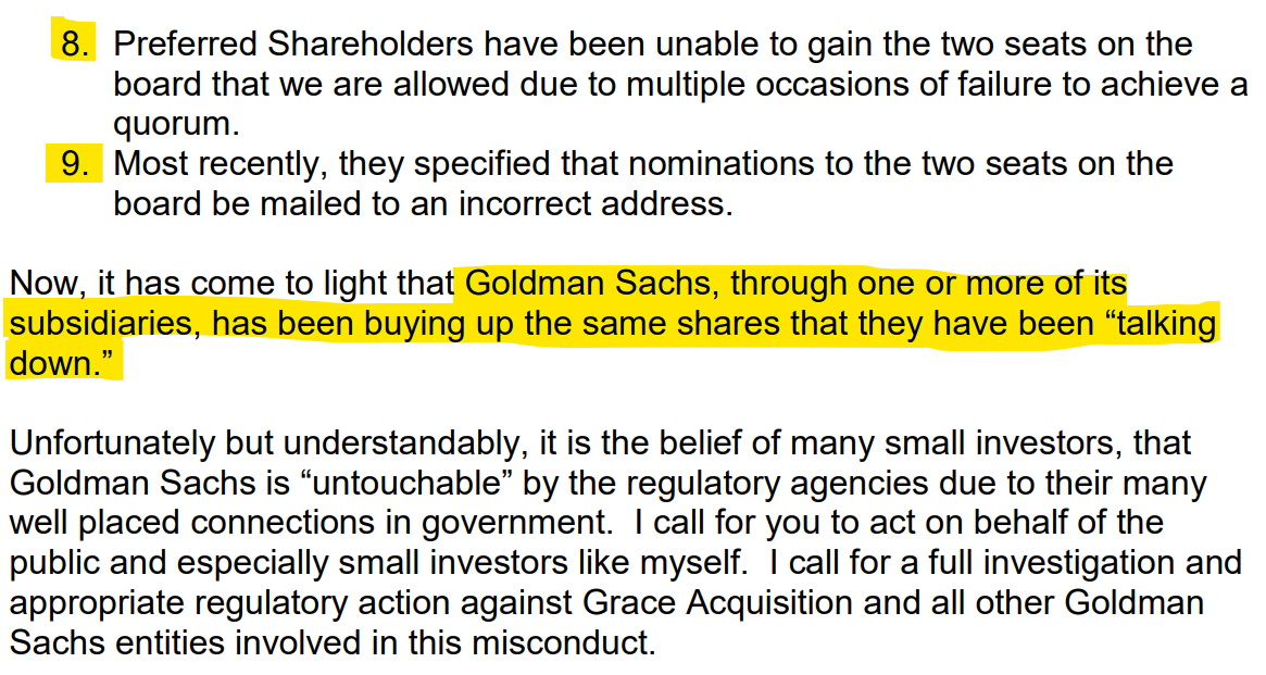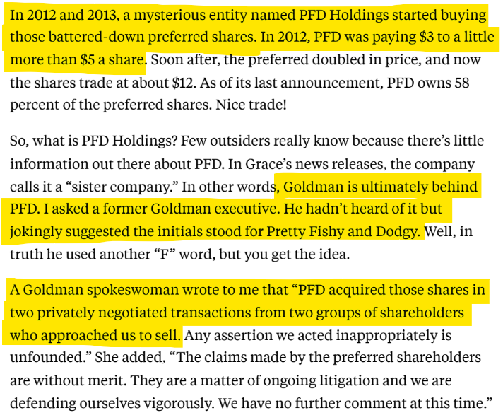 He suspected that Goldman was purposefully pushing the price of the preferreds down so they could repurchase the shares at a steep discount. Why pay $145 million for the preferreds if you can buy them at an 80%+ discount later?