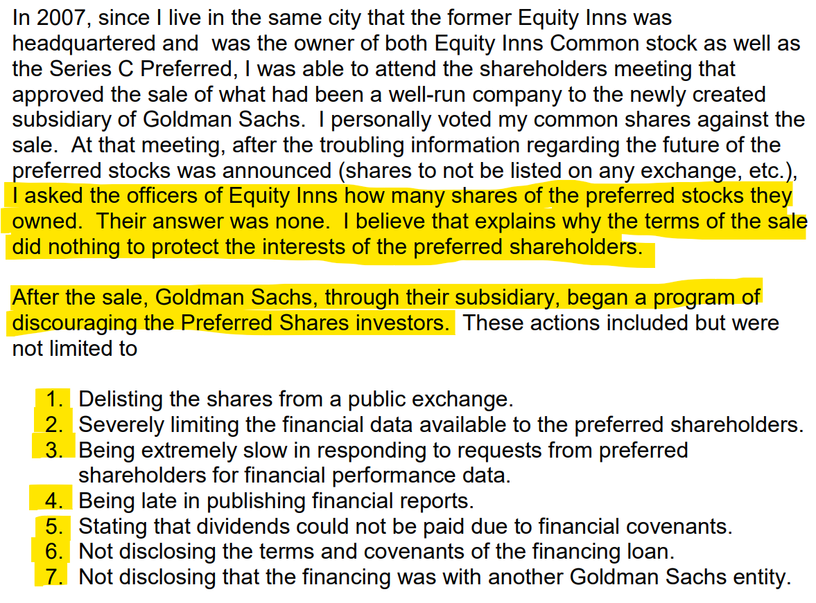 -In hindsight, it is clear Goldman made many mistakes here. One of the most interesting (and ironic) is that when they issued the W2007 preferred stock to replace the preexisting Equity Inns preferred stock, they chose against making the shares DTC eligible (probably to limit trading capability and push the price lower). This caused many brokers to put their client shares directly in their names and mail them stock certificates – which is likely a big reason why the company had more than 300 recordholders.