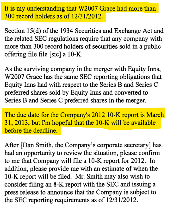 He wanted to force W2007 Grace to file public reports again – partly because he thought it was the right thing to do, and partly because he thought it would cause the stock (which he now owned a significant amount of) to go higher.