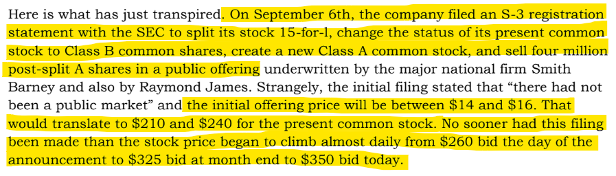 The IPO of a sleepy OTC stock is almost always good news for the prior OTC shareholders. Larry discusses the experience in his partnership letters: