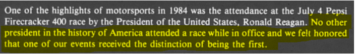 Starting from a small base, NASCAR was growing in popularity in the 1970s and 1980s. Widespread TV adoption and use helped transform the sport from a southern spectacle to a national and later international one. In 1984, Ronald Reagan was the first president to attend a race.