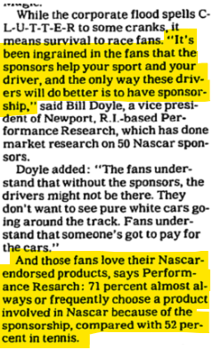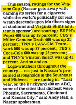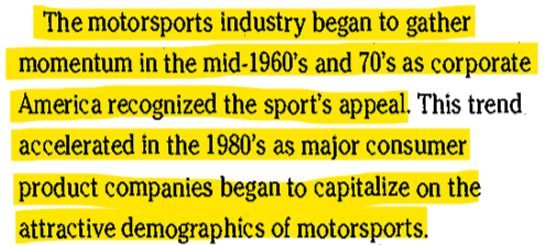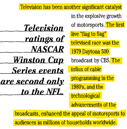 The positive business momentum proved persistent. NASCAR continued to gain popularity, increase capacity, raise prices, and opportunistically add venues. By the mid-1990s, ratings were through the roof, and sponsors were knocking down NASCAR's door.