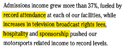 NASCAR's core customers were hit particularly hard by the GFC. These were working class Americans concentrated in the Southeast. Limited disposable income reduced attendance. Decades of capacity expansion finally resulted in empty seats. The flywheel worked in reverse. Fewer ticket sales, less concessions and merchandise revenues, fewer and lower sponsorship rates. Operating deleveraging ensued.