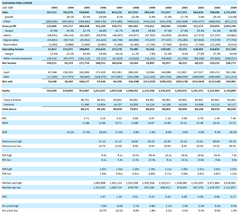 Profitability was mixed, depending largely on the price of copper. The company made money most years and had a large and growing tangible net worth. The average ROE from 1994 to 2004 was 13.8% – fluctuating from a low of 2.6% in 1999 to a high of 39.3% five years later in 2004.