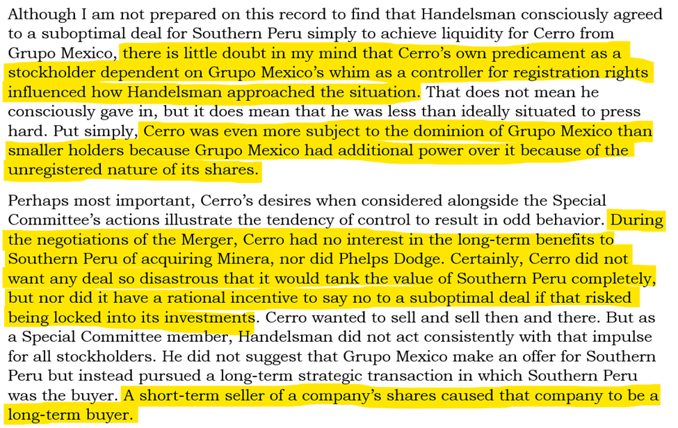 So, the Pritzker’s incentives (and, by extension, Harold Handelsman’s) were different from the average minority shareholder: they wanted to get the deal done so they could sell their shares. While a lower price for Minera Mexico would have been preferable, their top priority was removing the restrictive legend from their stock certificates.