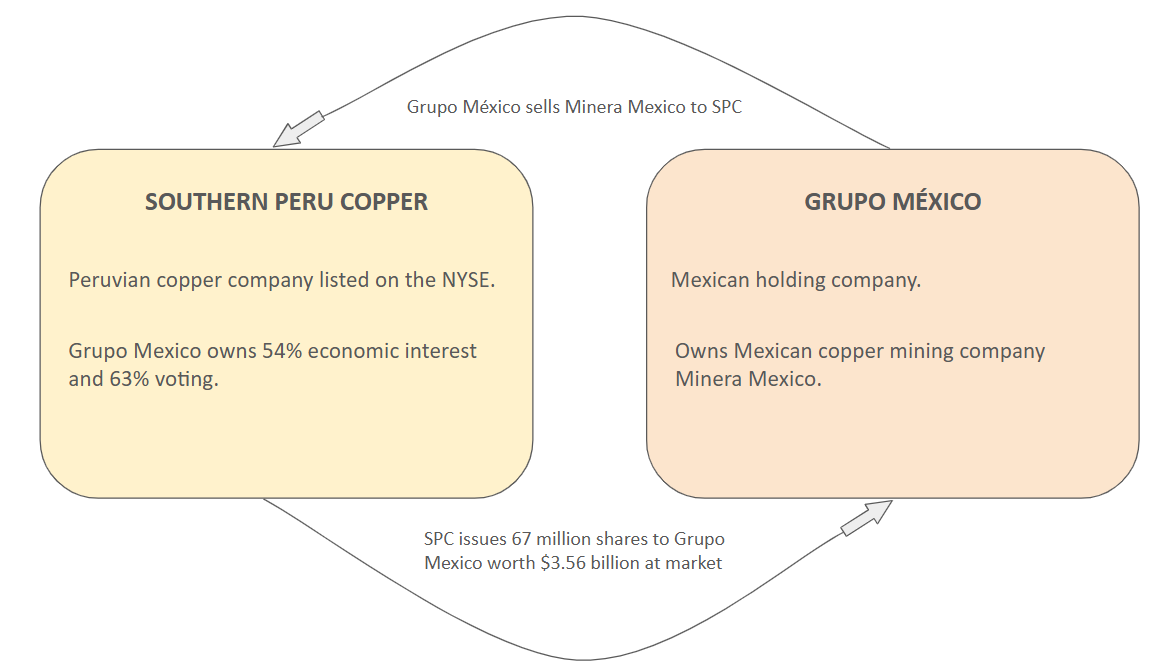 In exchange for Minera Mexico, Grupo Mexico’s opening proposal was to be paid $3.1 billion in shares of SPC stock. By the time a deal was struck, SPC had agreed to pay $3.56 billion worth of its stock for Minera Mexico, more than Grupo Mexico’s original ask.
