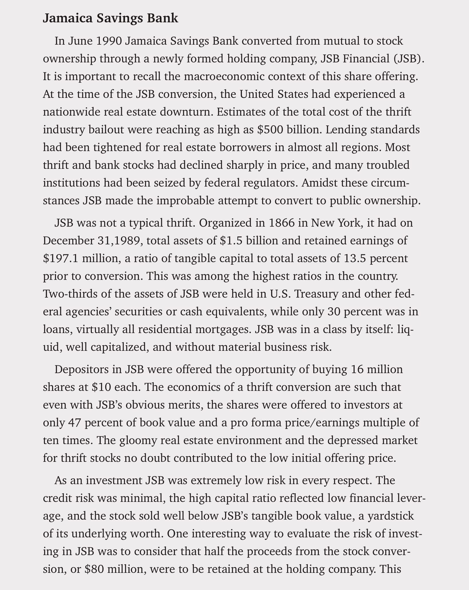 Less than two years later, on June 24, 1990, JSB Financial went public. Santa Monica bought 59,000 shares at $10 per share for an initial investment of $590,000. The pro-forma book value was $21 per share (0.48x P/TBV).