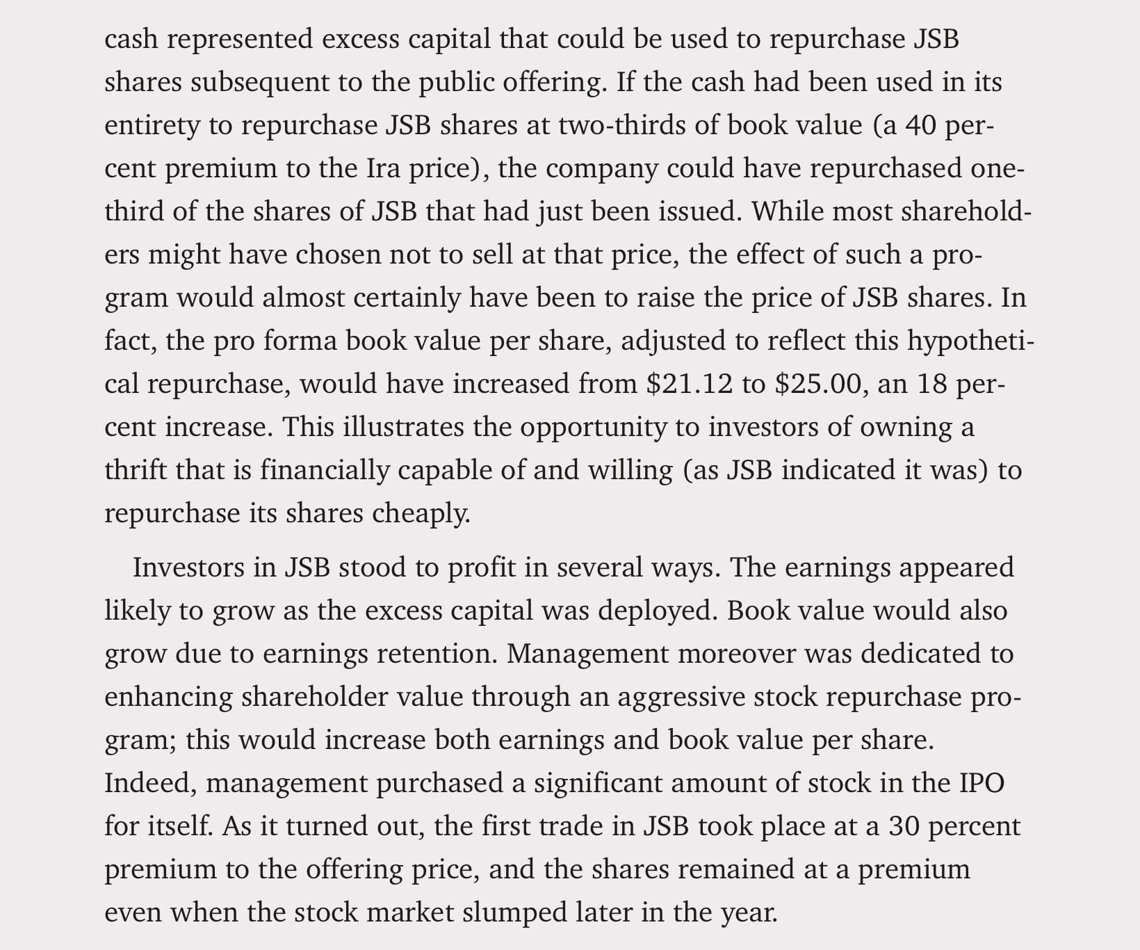 Seth Klarman wrote about JSB in his book, Margin of Safety. Below are the excerpts for those who want additional detail.