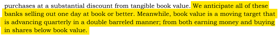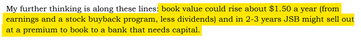 Following this logic, BVPS could be north of $25 within three years and the company would be worth $35 per share to a strategic buyer at 1.4x TBV. This works out to a 51% annualized return over three years.