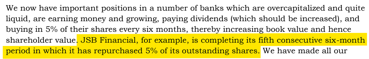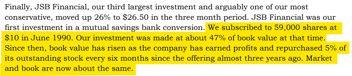 JSB became an avid repurchaser of its own stock, buying back 7% of its outstanding shares in 1991 and another 8% in 1992.