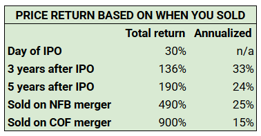 Then, seven years later in 2006, NFB merged with Capital One Financial (with the option to receive cash or stock).