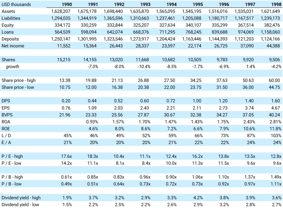 The share count was further reduced by 10% in 1993, 9% in 1994, 2% in 1995, and 7% in 1996. Shares outstanding fell by a cumulative 38% from 1990 to 1998. And most of these buybacks were done at or below tangible book value.
